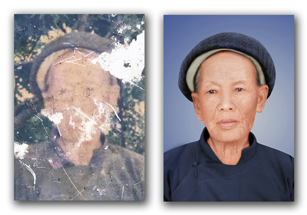 但对于特别破烂的照片,又是绒面的,带布纹或斑点的。就要用翻新的手段来处理,全面的修整照片,要不就会出现脏兮兮的感觉。为了尽量避免照片做得像平面,可以在后期处理上下功夫。比如添加杂色或移植皮肤层等等,把照片做旧。结合色彩的渲染和背景的处理可以让照片在保持原有相貌不变的情况下焕然一新。当然我们做照片要尽量保持它的历史价值能不换背景的尽量不换,能不改变色彩的尽量不改变。那些不能用简单工具修补的照片尽量不要拿去修(比如需要手绘处理的过程越复杂 变形的可能就越大),扫描到电脑保存就可以了。但每个人的想法不同,顾客的想法千差万别,破坏程度比较大的照片有的你要想保持原貌是很难的。